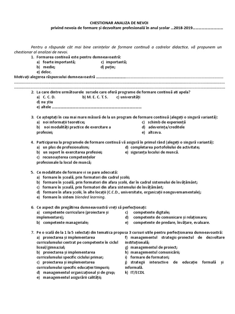 Chestionar Analiza De Nevoi Privind Nevoia De Formare și Dezvoltare Profesională In Anul școlar 2018 2019