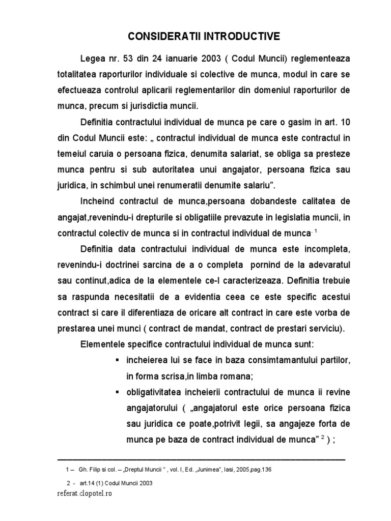 Contract Individual De Munca Titlul Ii Codul Muncii Art 10 Art 110