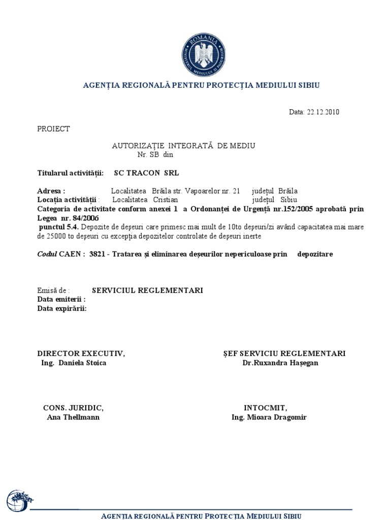 Autorizatie Integrata De Mediu Agentia Regionala Pentru Protectia