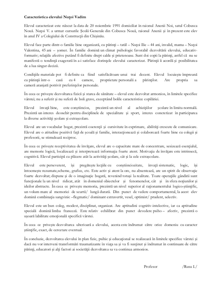 Este caracterizarea ceruta la tribunal in cazul divortului parintilor. L am folosit ca model pentru a caracteriza un elev ce urma sa se inscrie la academia de politie modelul prezentat l am completat cu datele elevului respectiv cu informatii personale note si aprecieri ale colegilor si ale domnilor profesori. Chicioreanu iti recomandam sa te uiti bine pe extras si pe imaginile oferite iar daca este ceea ce ti trebuie pentru documentarea ta il poti descarca. Studiu de caz caracterizare elev in adapt area scolara caiet practica.