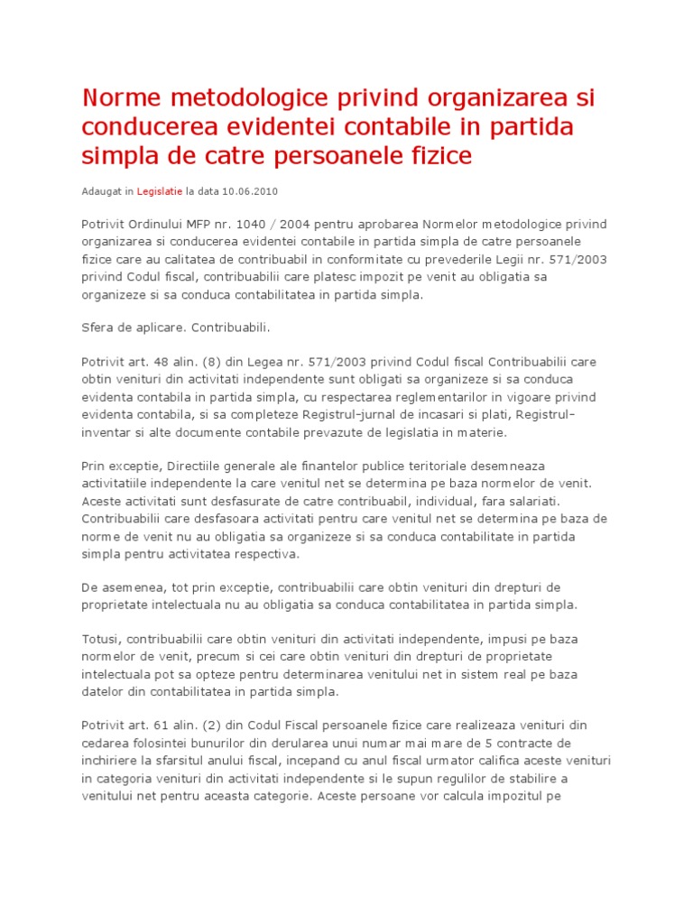 Norme Metodologice Privind Organizarea Si Conducerea Evidentei Contabile In Partida Simpla De Catre Persoanele Fizice