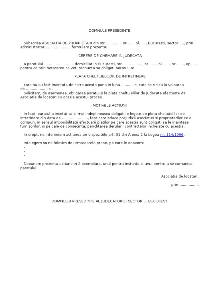 Cerere Chemare In Judecata Asociatia De Proprietari