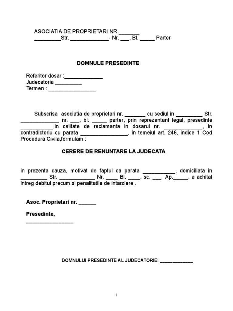 Cerere Renuntare Judecata Cerere De Chemare In Judecata Asociatii De Proprietari Recuperare Cheltuieli De Intretine