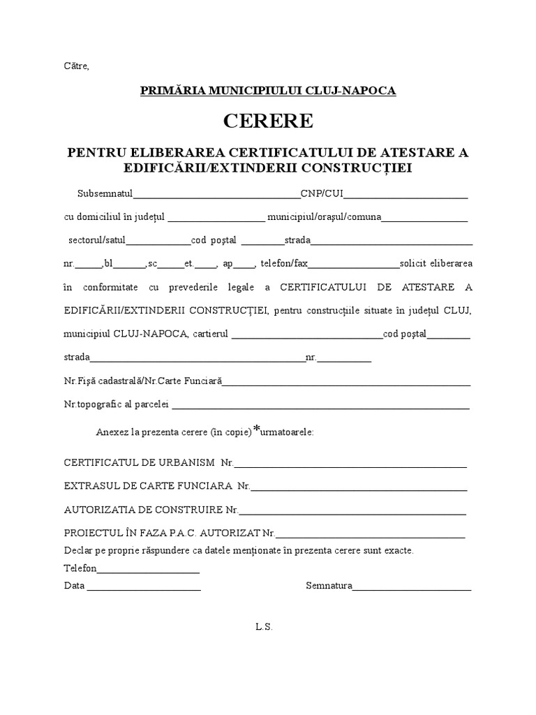 Cerere Tip Certificat De Atestare A Edificarii Extinderii Constructiei