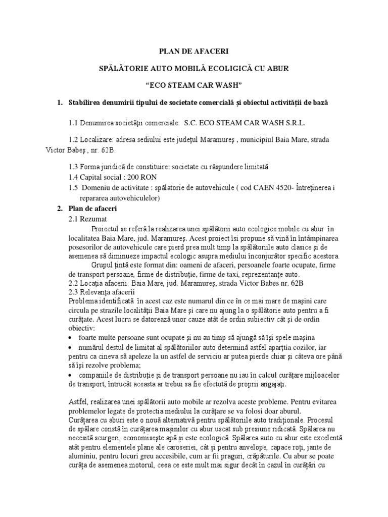 Plan De Afaceri Spălătorie Auto Mobilă Ecoligică Cu Abur Eco Steam Car Wash 1 Stabilirea Denumirii Tipului De Societate Comercială Si Obiectul Activităţii De Bază