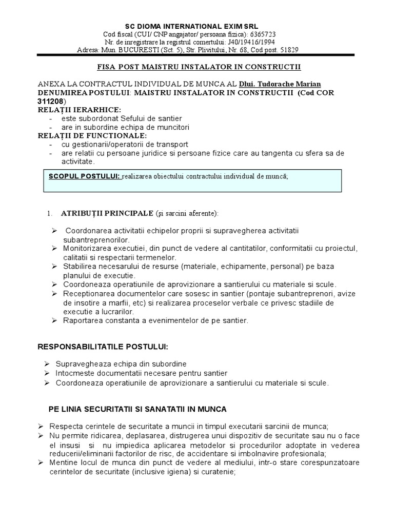 Fisa Post Maistru Instalatii Constructii Tudorache Dioma
