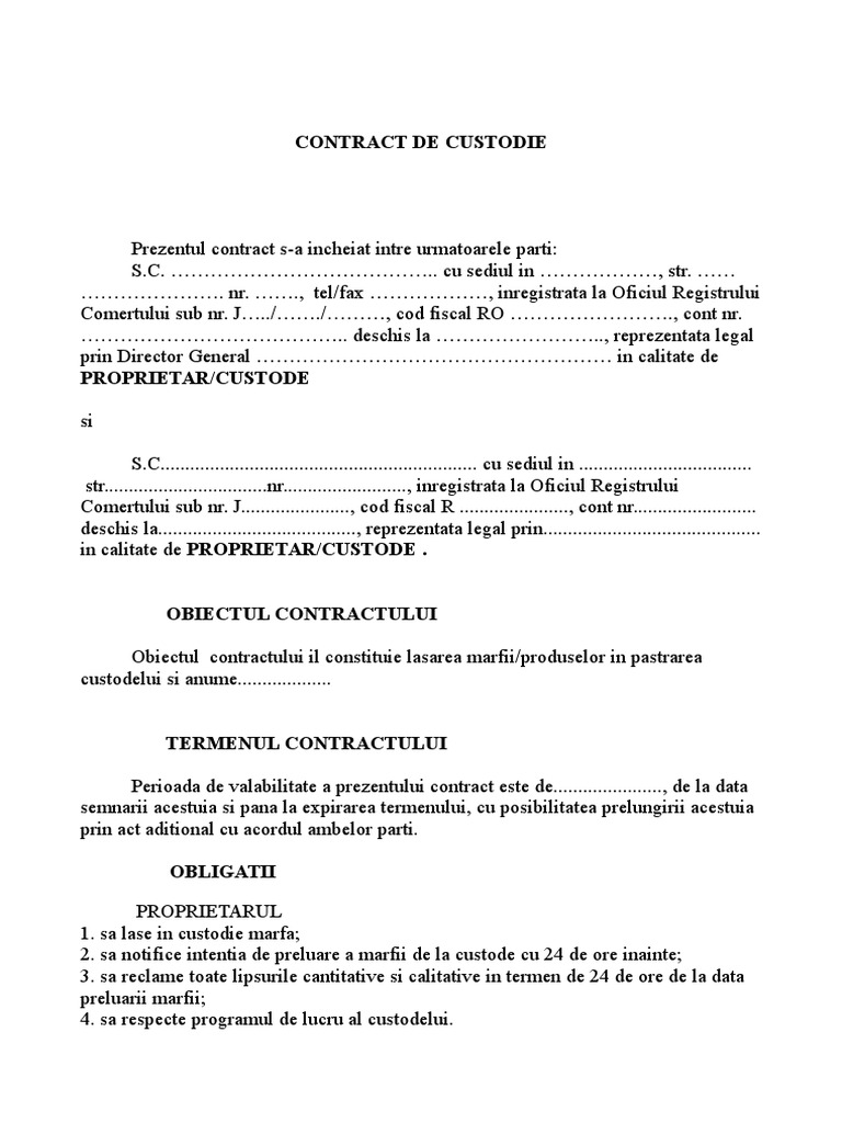 Prezentul contract s a incheiat intre urmatoarele parti. De comun acord am convenit azi ora la încheierea prezentului proces verbal în baza căruia am procedat la predarea de către predator şi primirea de către primitor a bunurilor prevăzute în lista anexă care face parte integranta din prezentul proces verbal. Contract de custodie model contract de custodie modele contracte tot ce aveti de facut este sa descarcati free download acest model de contract de custodie si sa il adaptati nevoilor unei firme sau pfa. S c cu sediul în înregistrată în registrul comerţului sub nr având cont bancar nr.