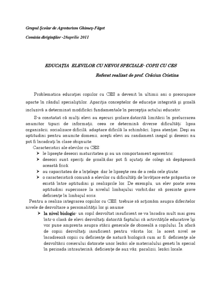 Referat Integrarea Copiilor Cu Ces In Scoala Publica Psihopedagogie 294416
