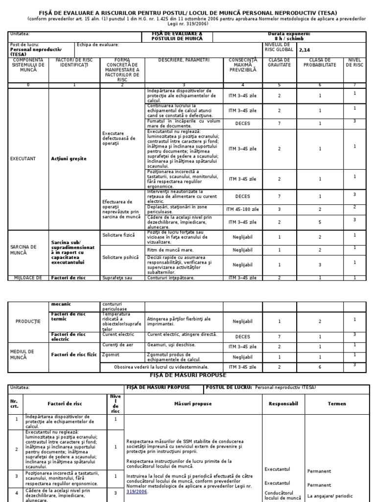 Accidentare profesională la locul de muncă. Evaluarea riscurilor ajută la diminuarea posibilităţii de vătămare a lucrătorilor şi de afectare a mediului ca urmare a activităţilor legate de muncă aceasta ajută de asemenea la menţinerea competitivităţii şi productivităţii. Introducere evaluarea riscurilor profesionale este o obligaţie a angajatorilor cerută de directivele europene transpuse în legislaţia naţională în cadrul procesului de aderare a româniei la uniunea europeană. Puteti descarca mai jos modelul integral.