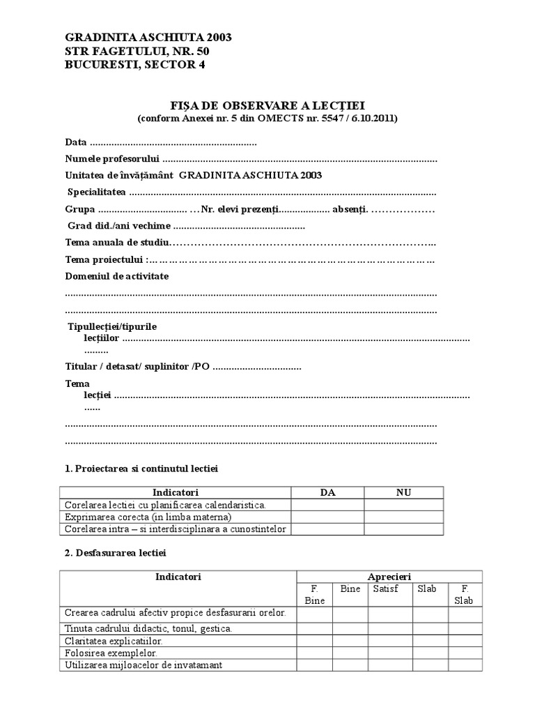Fisa De Observare A Activitatii Didactice In Gradinita Completata