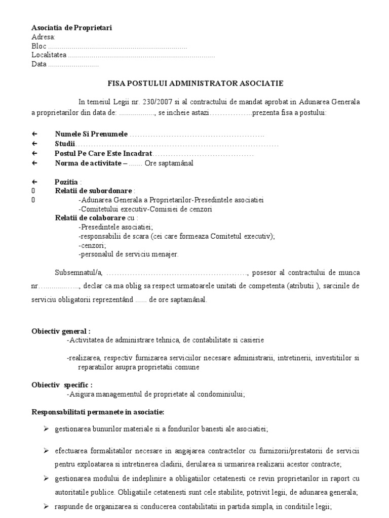 Fisa Postului Administrator Asociatie