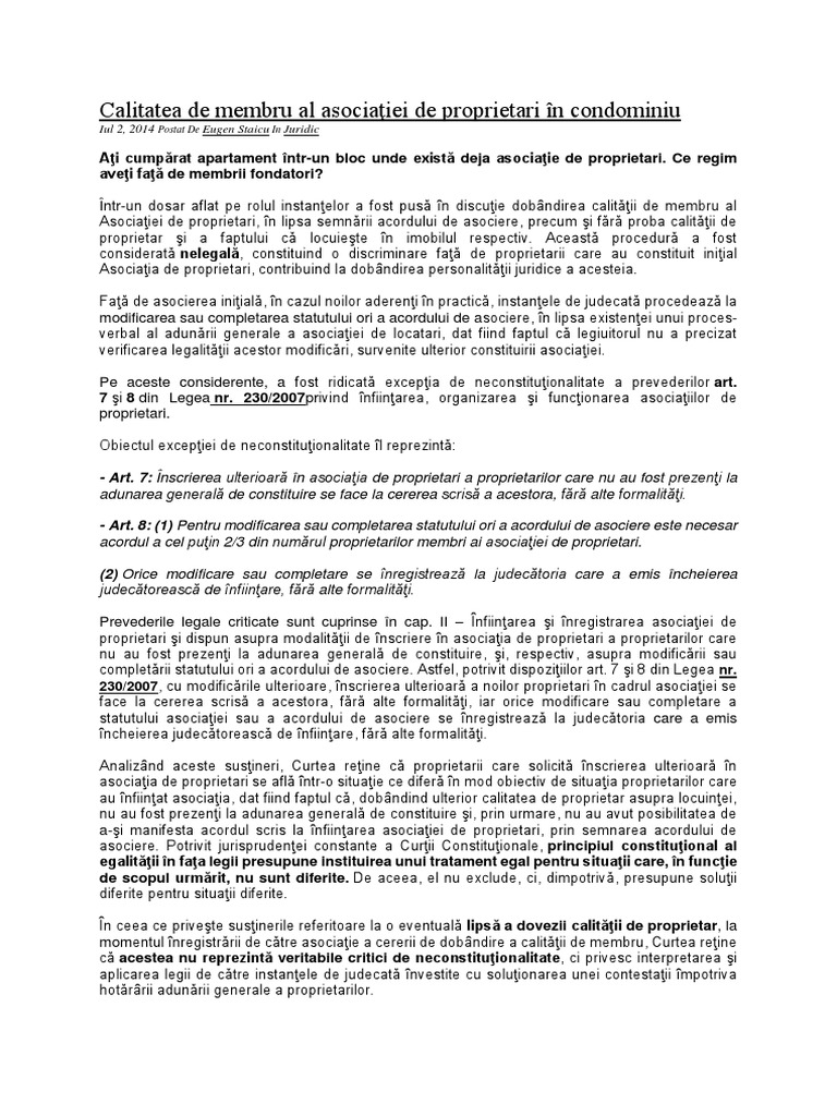 Calitatea De Membru Al Asociaţiei De Proprietari In Condominiu Docx