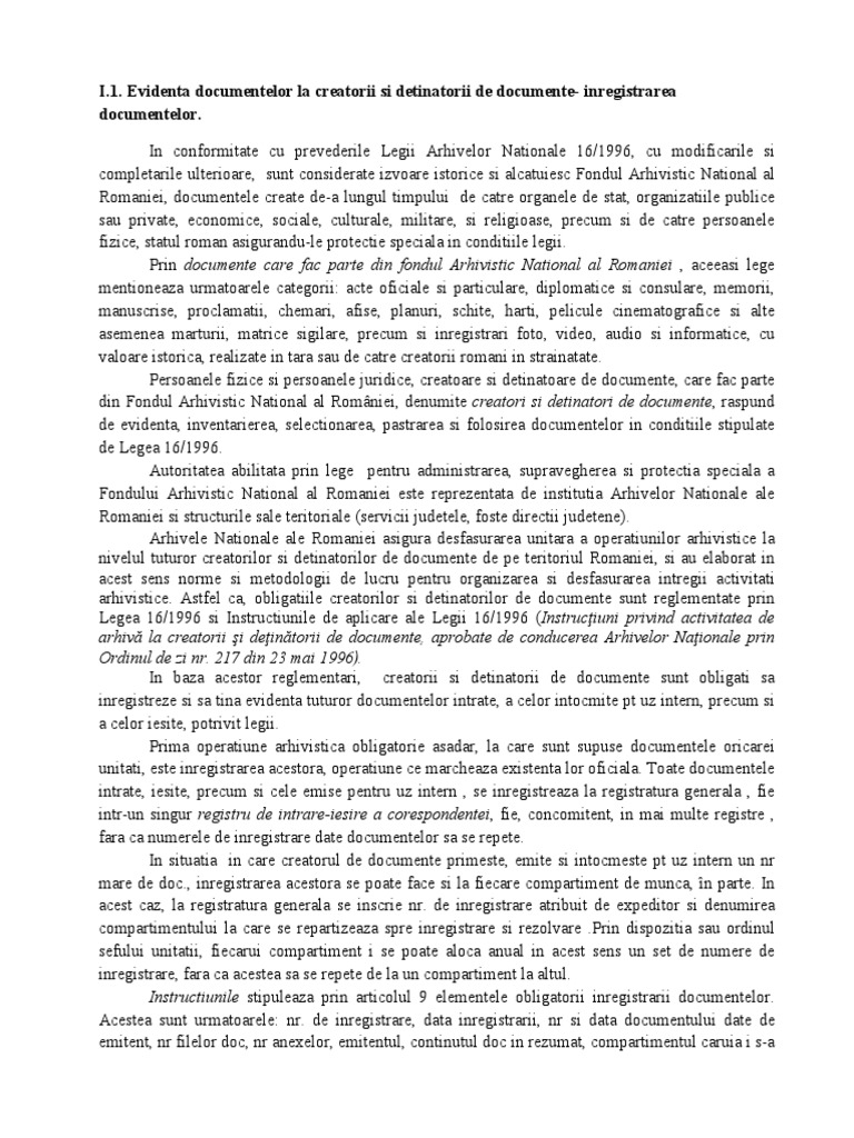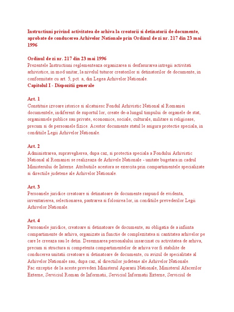 Instrucţiuni Privind Activitatea De Arhivă La Creatorii Si Deţinătorii De Documente Aprobate De Conducerea Arhivelor Naţionale Prin Ordinul De Zi Nr 217 Din 23 Mai 1996