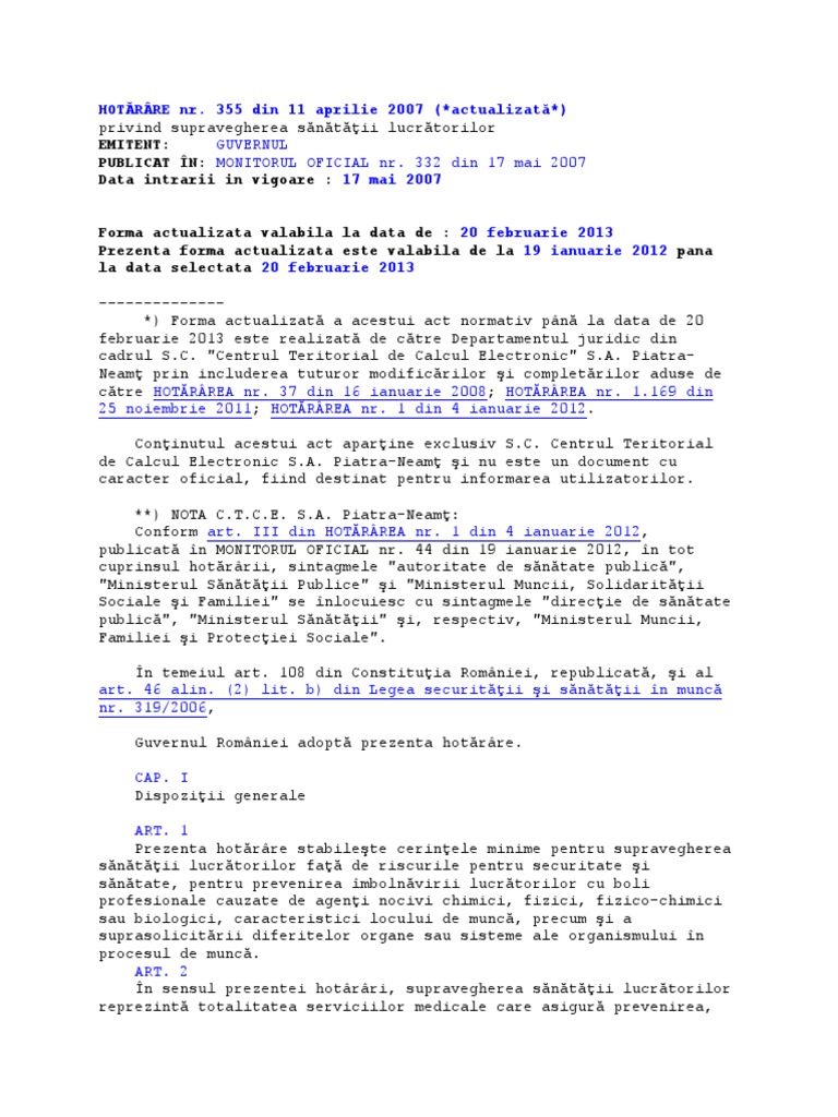 Hg Nr 355 2007 Privind Supravegherea Sanatatii Lucratorilor Actualizata La 21 01 2008