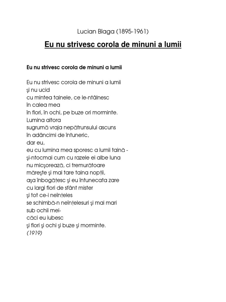 Lucian Blaga Eu Nu Strivesc Corola De Minuni A Lumii Pdf