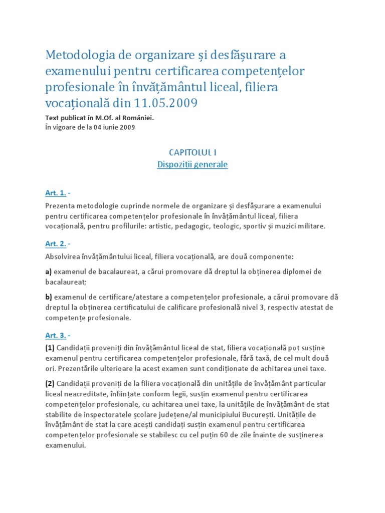 Metodologia De Organizare și Desfășurare A Examenului Pentru Certificarea Competențelor Profesionale In Invățămantul Liceal