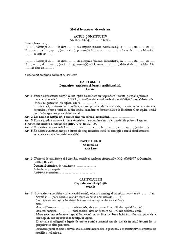 Model Act Constitutiv Societate Cu Răspundere Limitată Cu Asociat Unic
