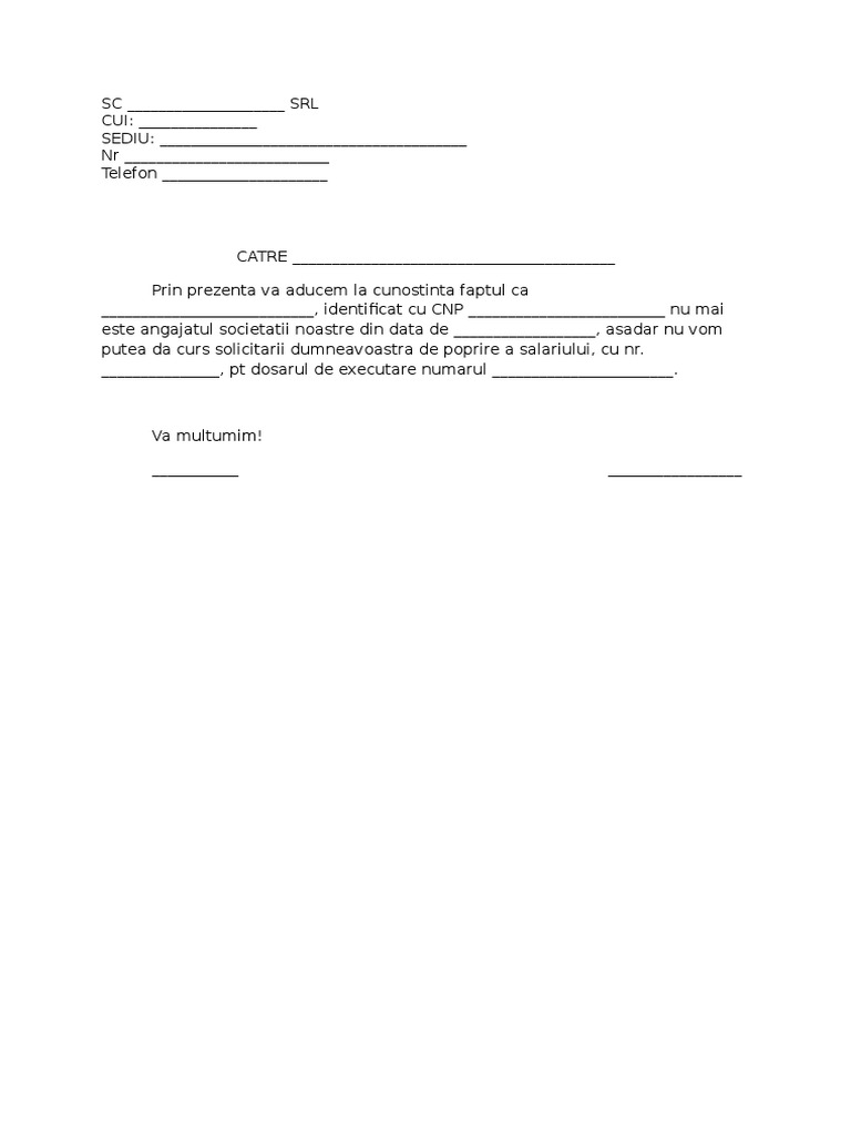 Adresa Informare Angajat Inactiv Poprire