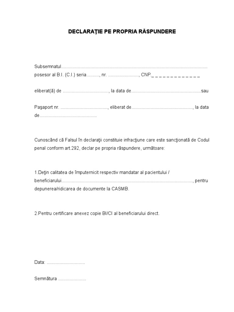 Declaratie Pe Proprie Raspundere A Imputernicitului