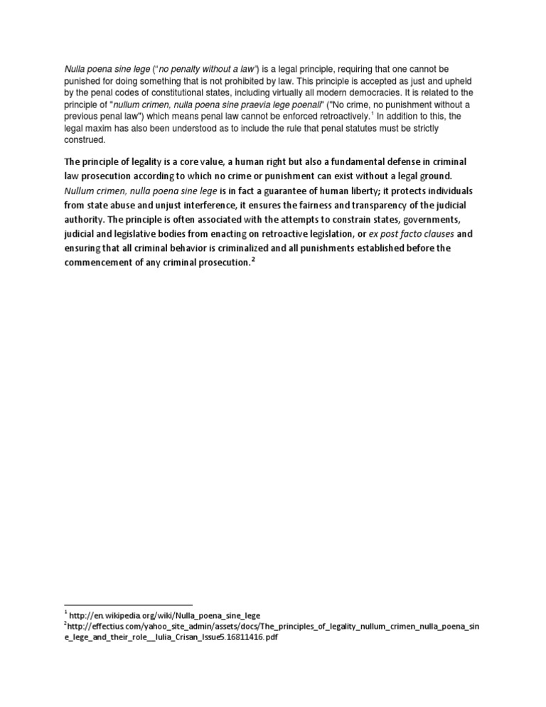 Book reviews author details and more at amazon in. This basic legal principle has been incorporated into international criminal law. How to say nulla poena sine lege in english. This idea is also manifested in laws that require criminal acts to be publicized in.