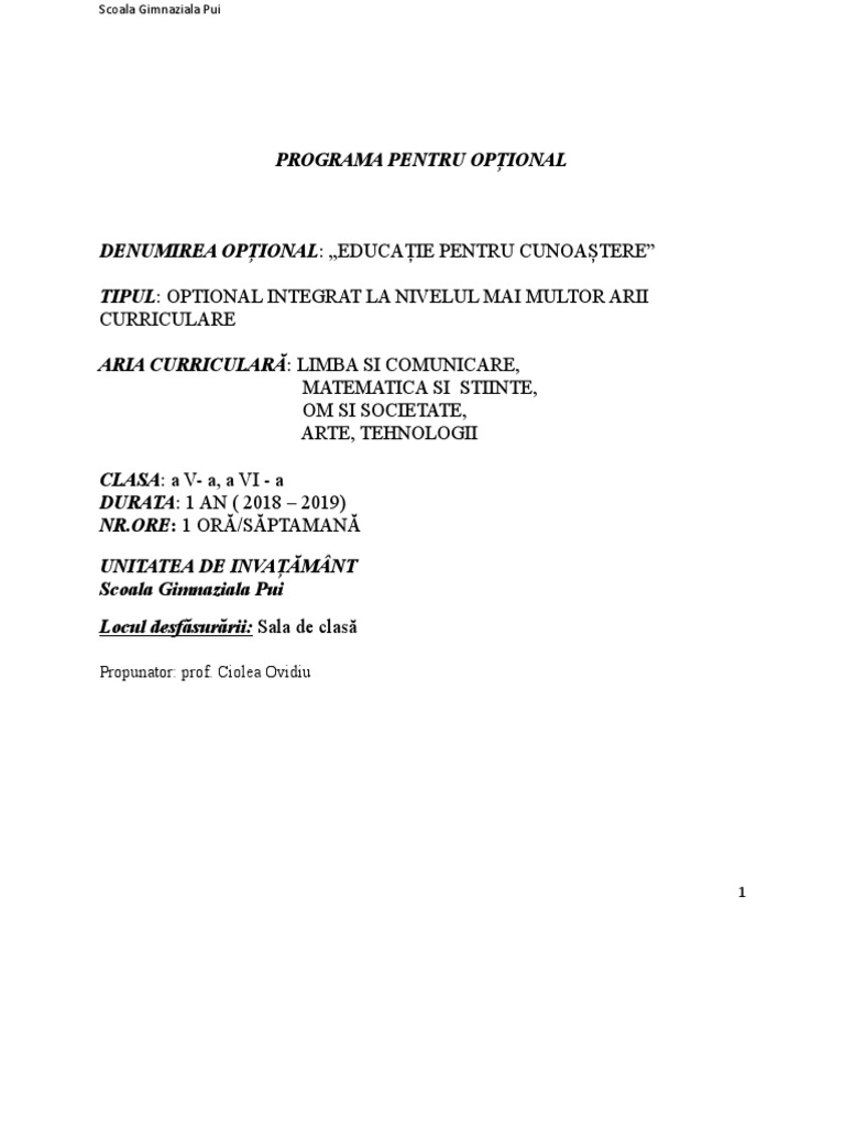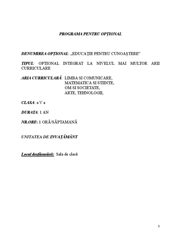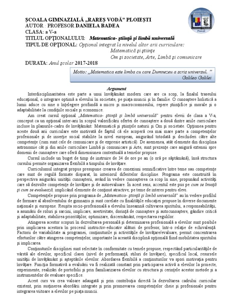 Programa Optional Docx Programa Colar Pentru Disciplina Opional Matematic I Tiine N Societatea Cunoaterii Curriculum Interdisciplinar Integrat Pentru Course Hero