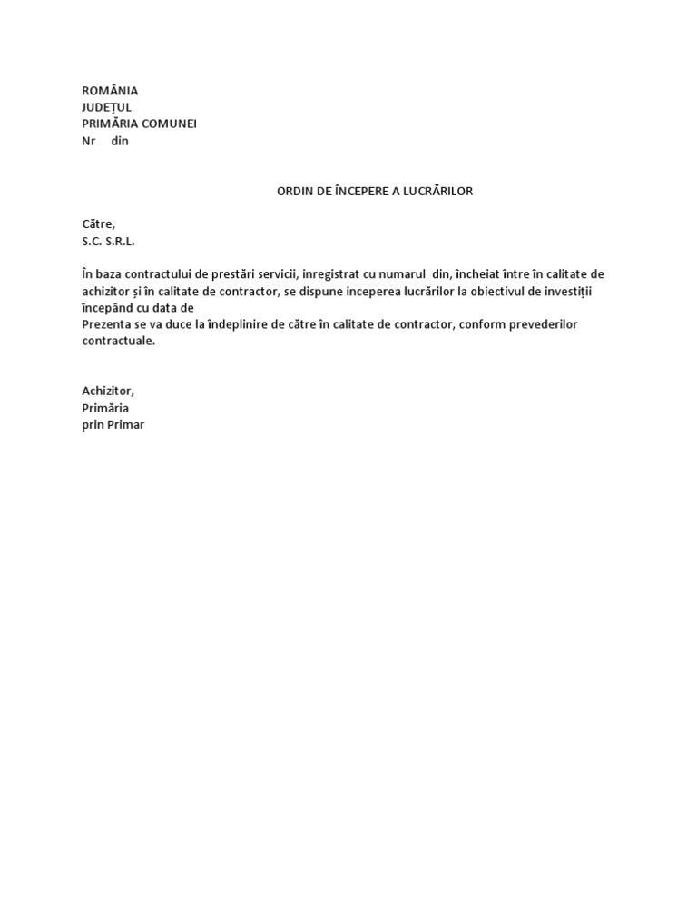 Model Ordin De Incepere A Lucrarilor Pentru Comune