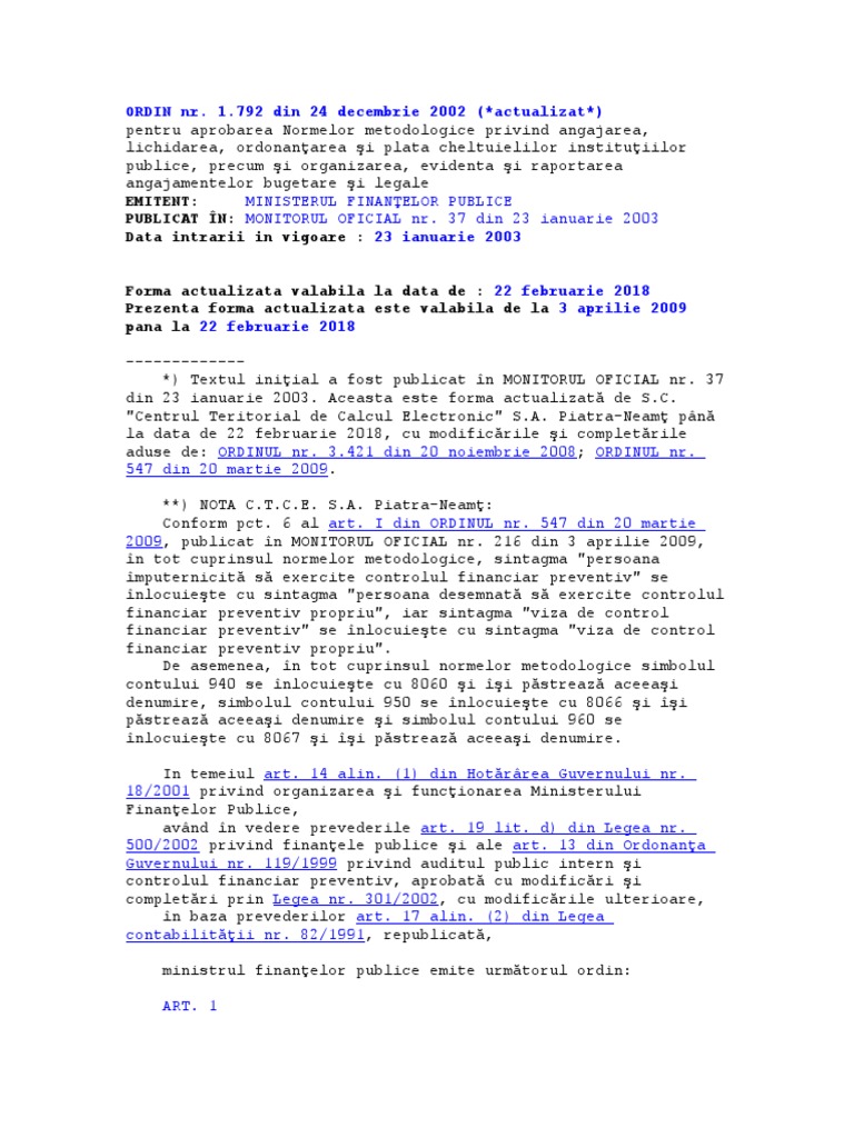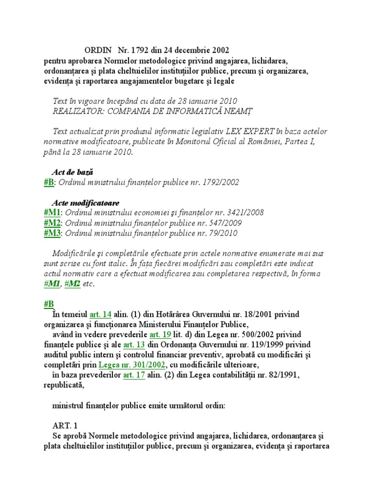 Norme Metodologice Privind Angajarea Lichidarea Ordonanțarea și Plata Cheltuielilor Instituțiilor Publice Precum și Organizarea Evidența și Raportarea Angajamentelor Bugetare și Legale Ordin 1792 2002 Lege5 Ro
