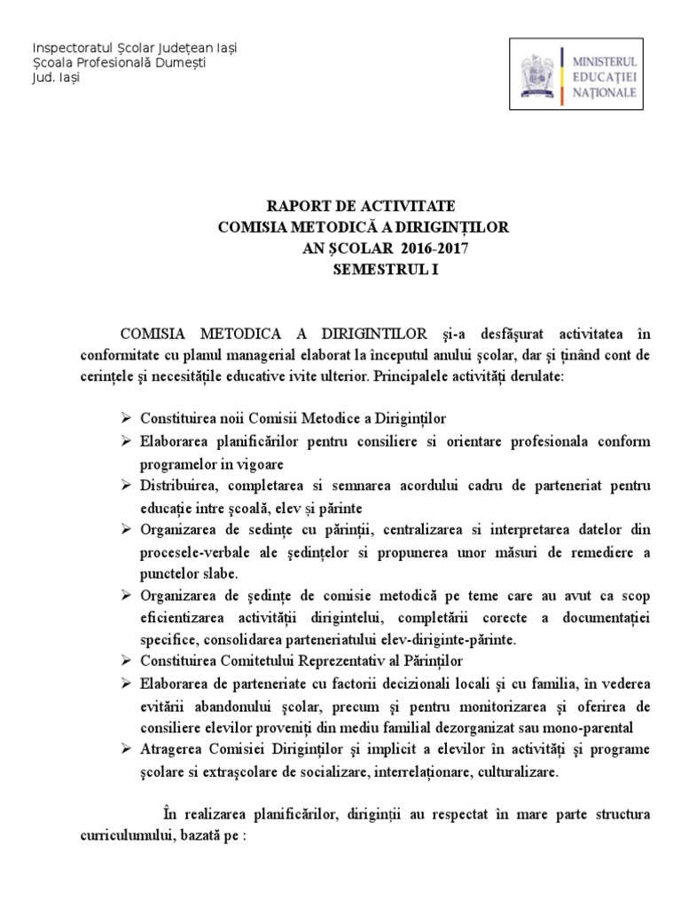 Raport Comisia Dirigintilor Sem I 2016 2017