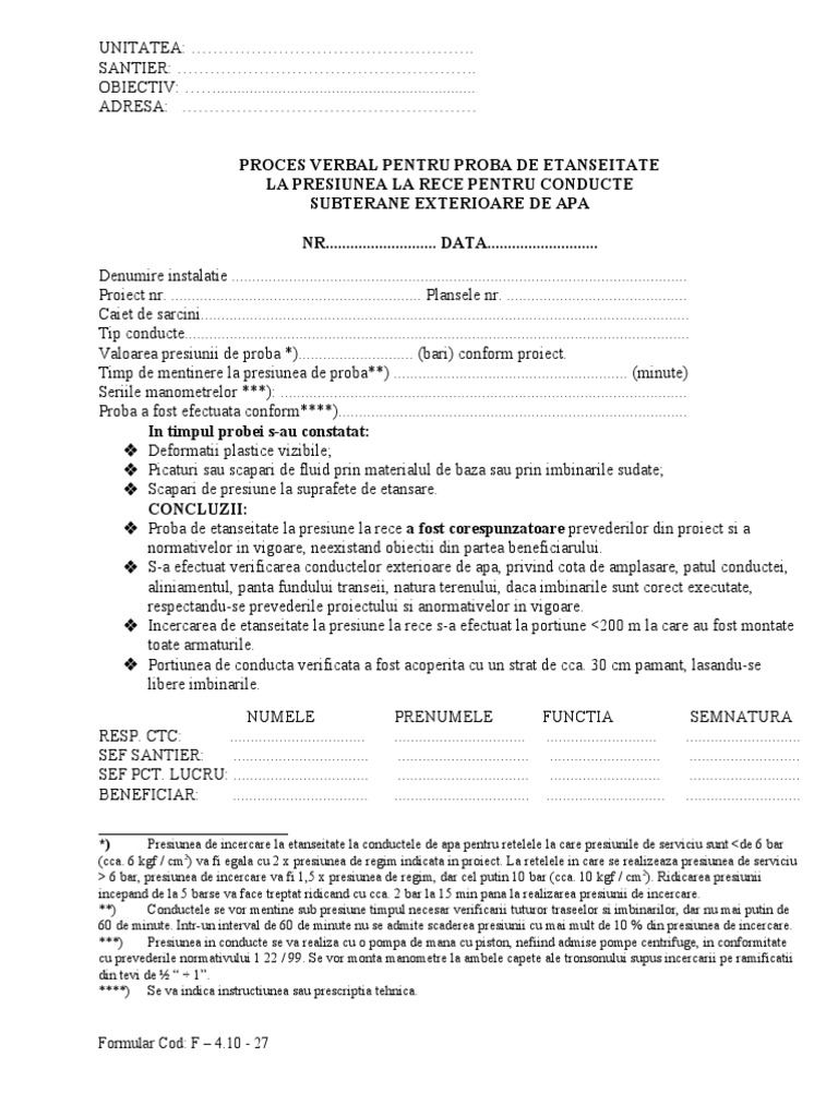 Proces Verbal Pentru Proba De Etanseitate A Conductelor Exterioare De Canalizare