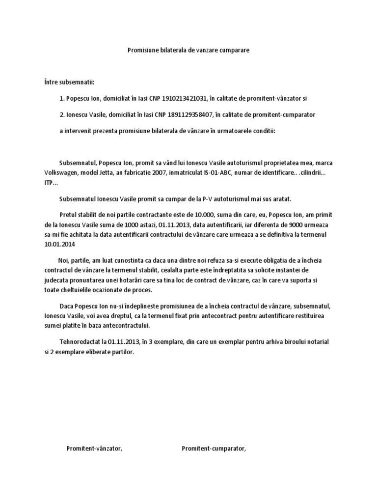 Promisiune Bilaterala De Vanzare Cumparare Model