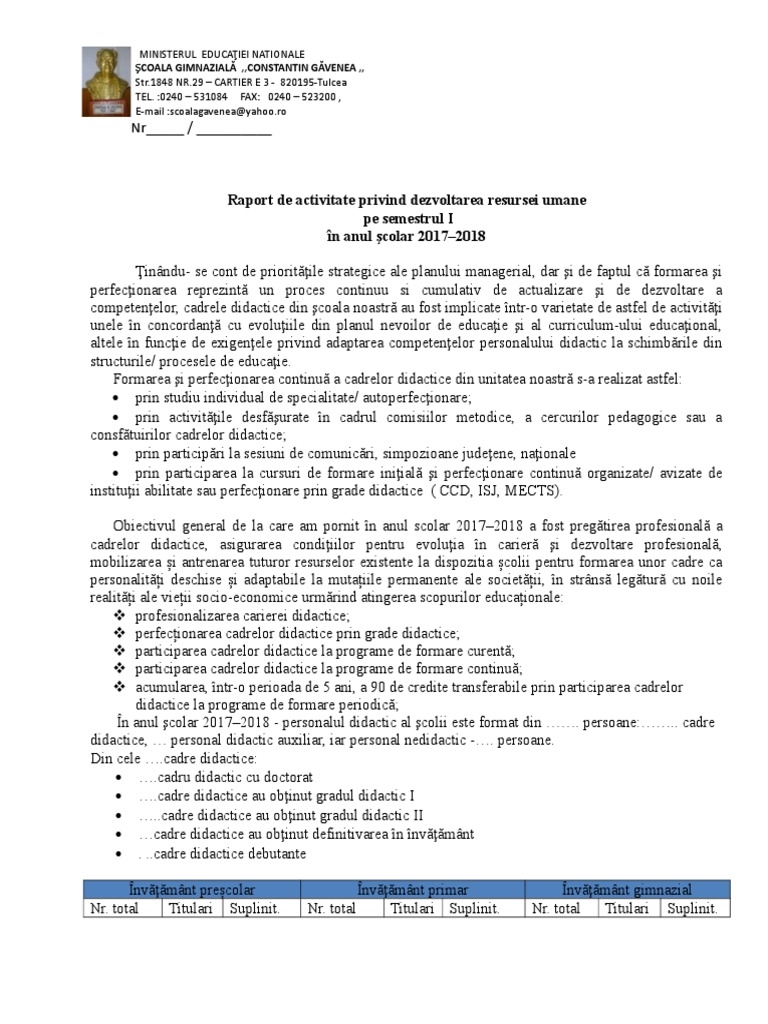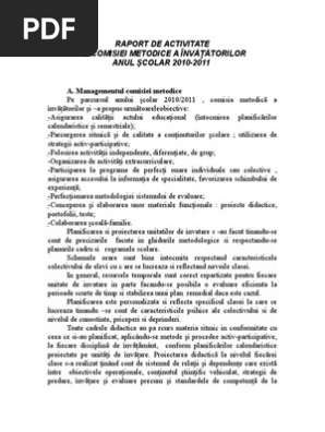 Primar ultima modificare 2018 10 06 20 15 activităti comisie metodica 2018 2019 pdf pdf document 134 kb 137870 bytes. Raportul de activitate elaborat a fost bine structurat şi a respectat cerinţele impuse de realizare a raportului de activitate conform fişei cadru de autoevaluare evaluare a cadrelor diactice pe parcursul unui an şcolar şi nu numai de asemenea raportul poate fi utilizat şi ïn cadrul raportării semestriale a. Analiza de nevoi puncte tari puncte slabe oportunităţi şi ameninţări 4. Raportul de activitate pentru anul şcolar 2018 2019 care va include pe lângă alte aspecte specifice activităţii desfăşurate la nivelul comisiei metodice analiza rezultatelor obţinute la probele de evaluare respectiv la evaluările naționale etc.