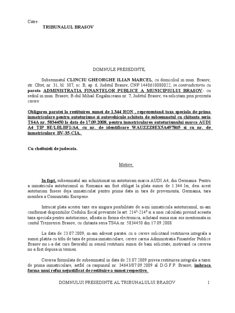 Model De Cerere Pentru Restituire Taxa Speciala Pentru Autoturisme