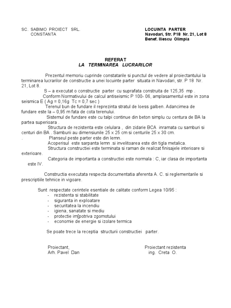 Referatul Proiectantului Terminarea Lucrarilor Model